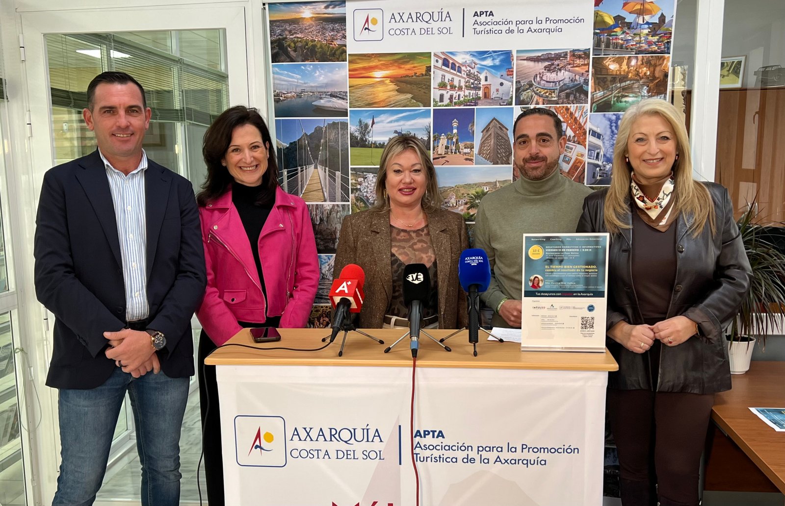 Rueda de prensa presentada por el presidente de APTA, Álvaro Hurtado, acompañado por Cynthia Díaz, coach, empresaria, emprendedora y CEO de Impulso Pura Vida, Manuel Martín, Vicepresidente de Impulsa Axarquía y Carolina Rodríguez delegada en Vélez-Málaga del Círculo de Empresarios de la Costa del Sol.