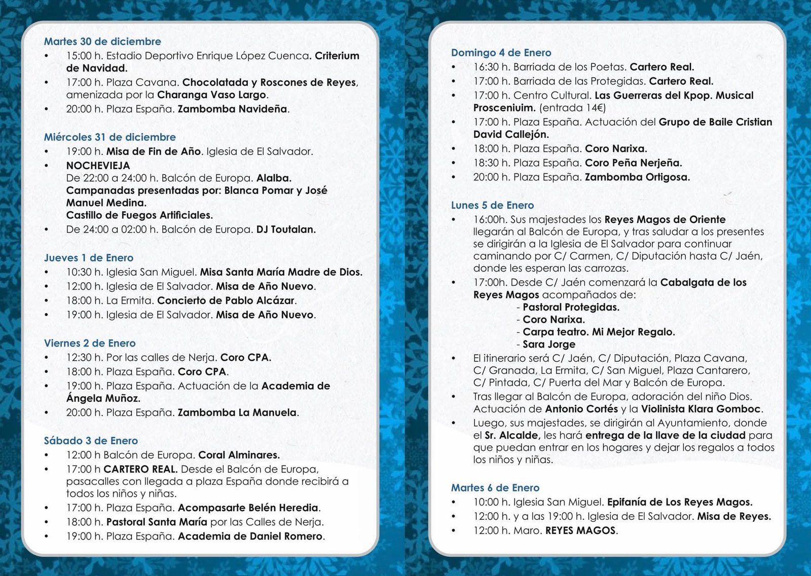 Lunes 5 de Enero: La Gran Cabalgata de Reyes Magos de Oriente (17:00 h). El itinerario comienza en la C/ Jaén y finaliza en el Balcón de Europa, donde los Reyes se dirigirán al Ayuntamiento para la entrega de la Llave de la ciudad.