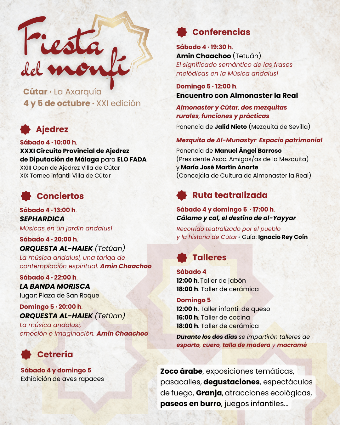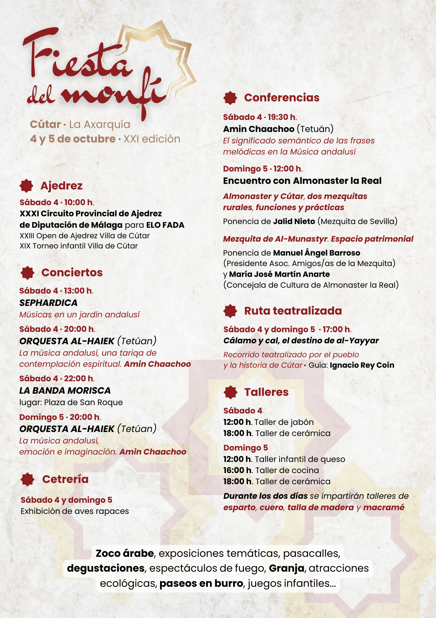 🗣️ Conferencias y talleres: Aprende sobre el legado andalusí y participa en talleres de jabón, cerámica, cocina y hasta la fabricación de objetos con esparto, cuero y madera.