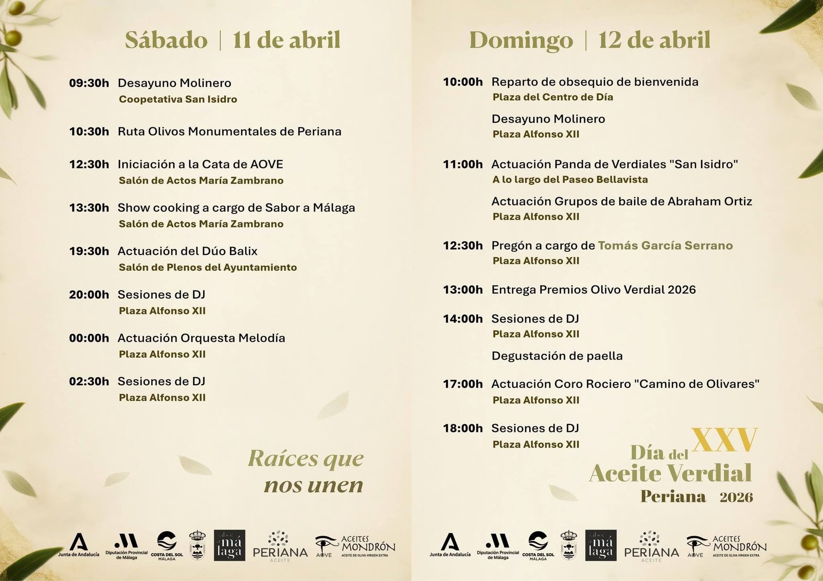 Mediodía: Pregón (Tomás García Serrano), entrega de Premios Olivo Verdial y degustación de paella.